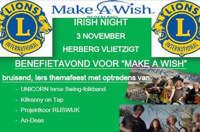Tijdens deze Irish Night staan een veiling en een loterij centraal om op deze wijze zoveel mogelijk geld voor Make a Wish Nederland op te halen. De avons wordt verder ingevuld met Ierse dansen en hapjes en een unieke Ierse bierproeverij, Entree € 29,50 waarvan € 10,- naar Make a Wish gaat.